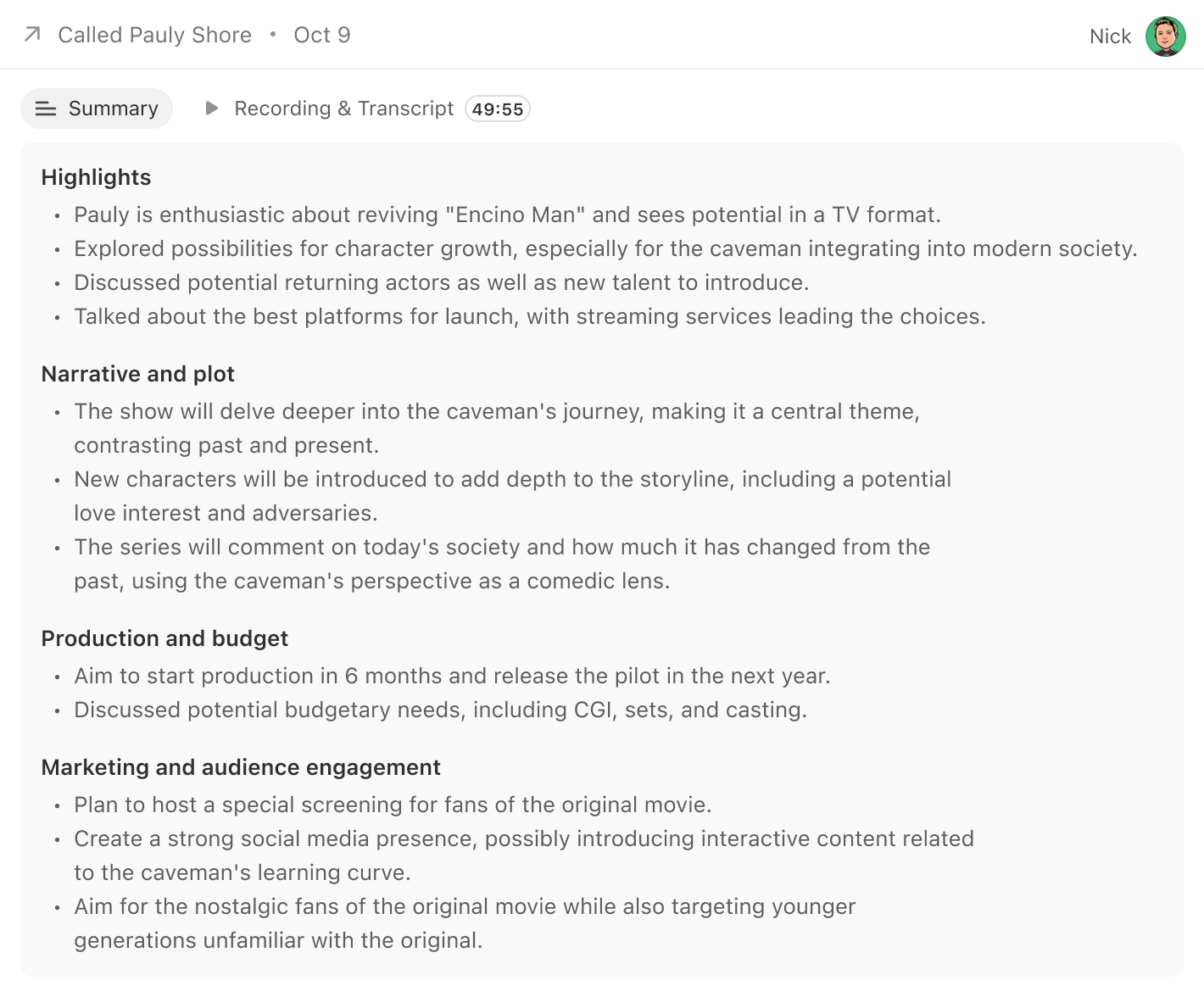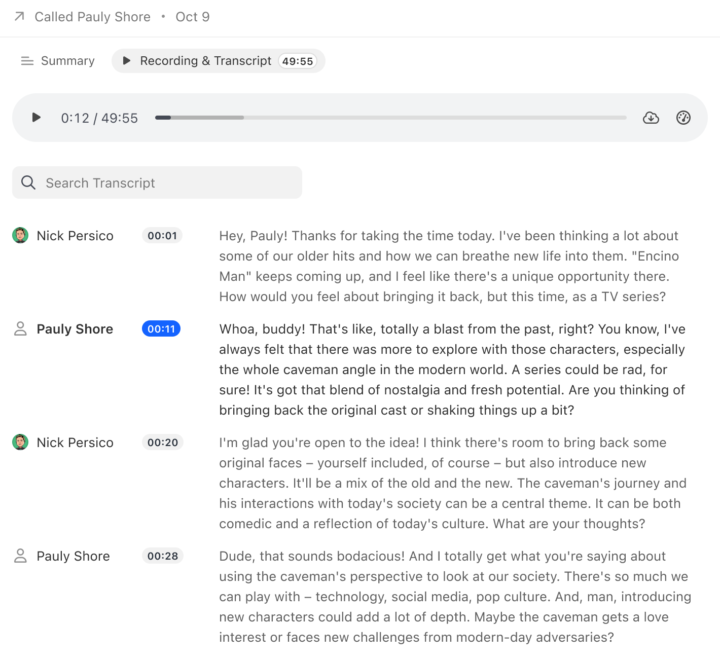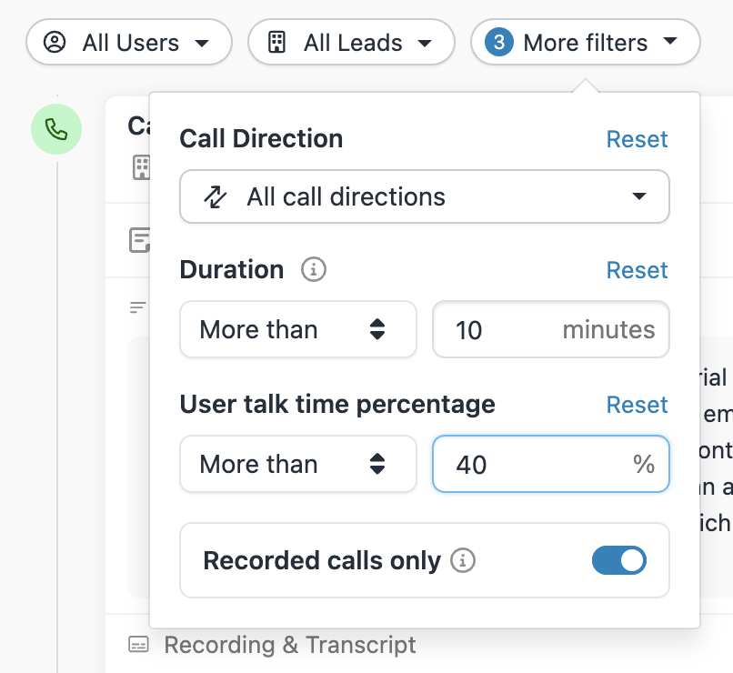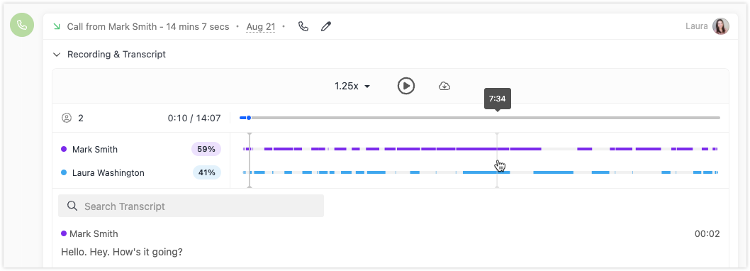 ** Transcripts, summaries, and talk time percentage are only available on calls made with Call Assistant enabled.