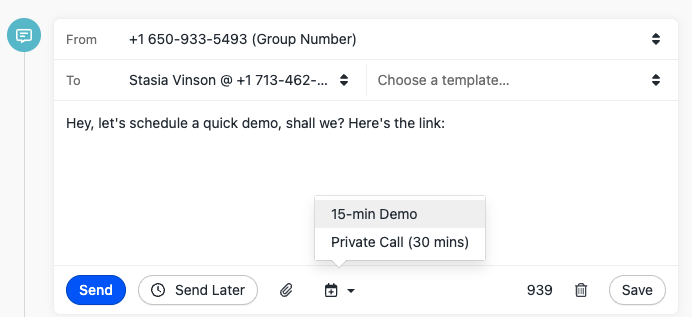 The quick insert menu is a new way of interacting with editors. By typing `/` you can insert a snippet, scheduling link, or template tags into the editors.
