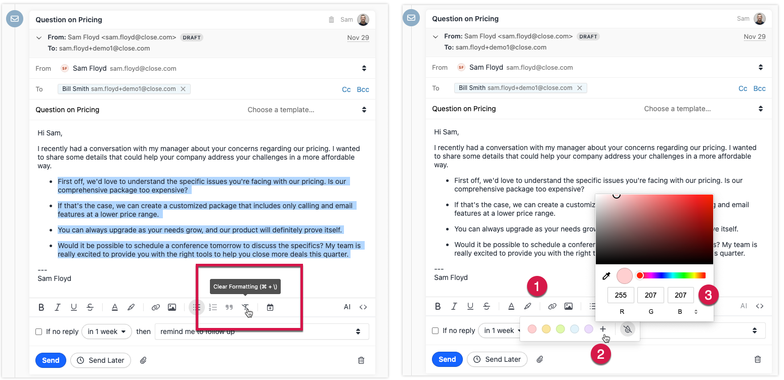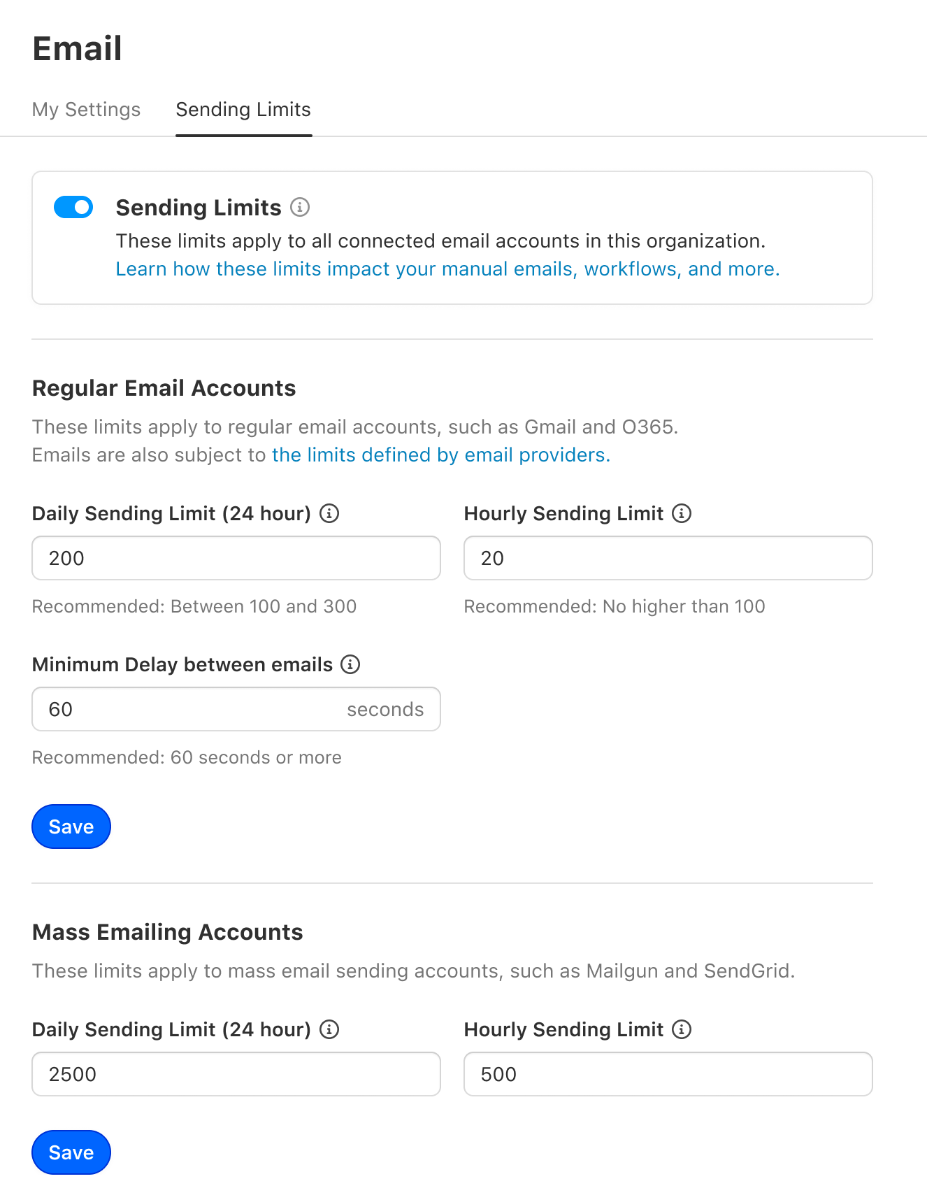 We released the email-sending limits, allowing admins to define the limits for both regular (Gmail, Outlook, etc.) and mass-sending email accounts (SendGrid, Mailgun, etc.). These limits affect all connected accounts within a single Close organization.
