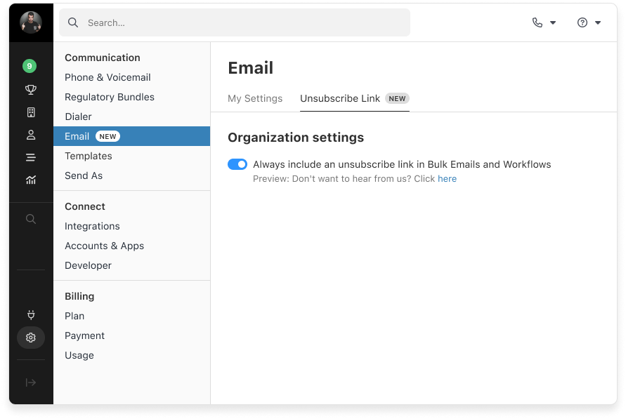 We've just released the basic email unsubscribe. Now, you can enforce adding a hardcoded unsubscribe link for your Bulk and Workflow emails (for your organization).