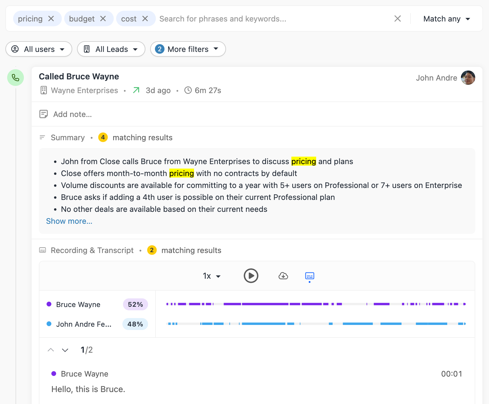We just launched a brand new AI-powered Call Assistant. When enabled, you'll gain new functionality on any calls recorded in Close.