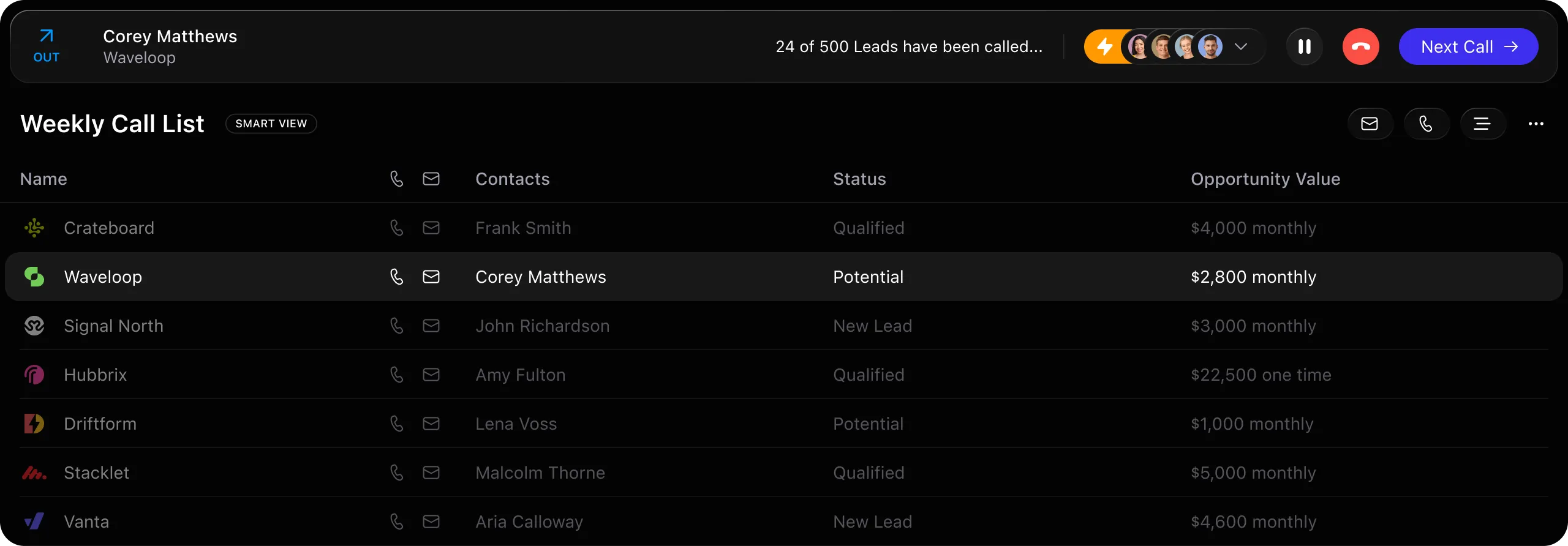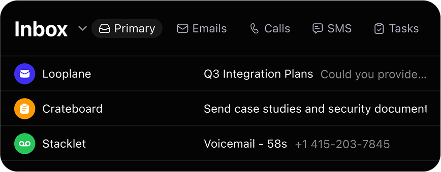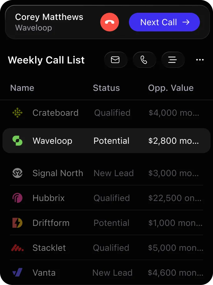Calling, email, SMS, and AI — all in one platform so your team can sell faster without switching tools.
