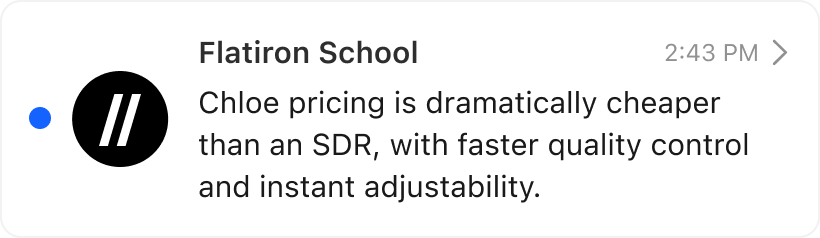 Chloe's pricing is dramatically cheaper than an SDR, with faster quality control and instant adjustability.