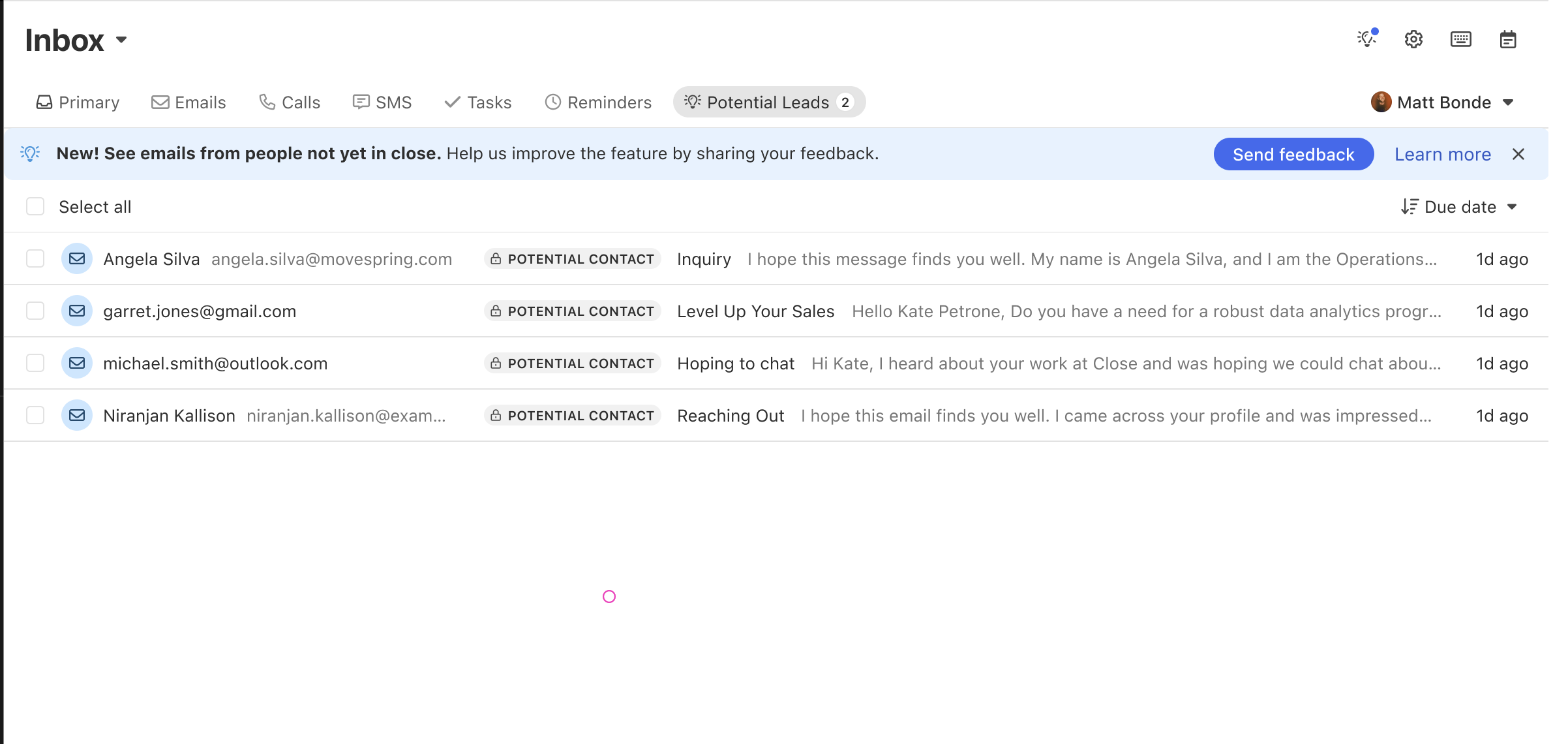 Manage all your communications in the Close Inbox––including messages from potential contacts not even in Close yet.