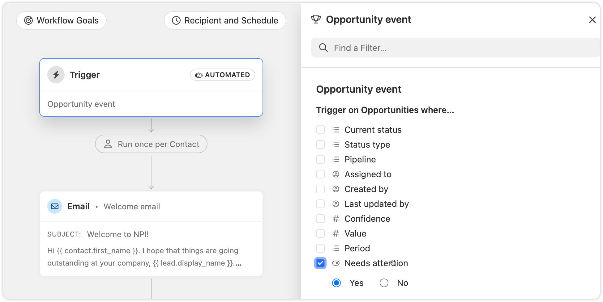 There’s a new toggle at the top of the Opportunity Pipeline that says “Needs attention.” Enable this to show only deals that have been flagged as needing attention.