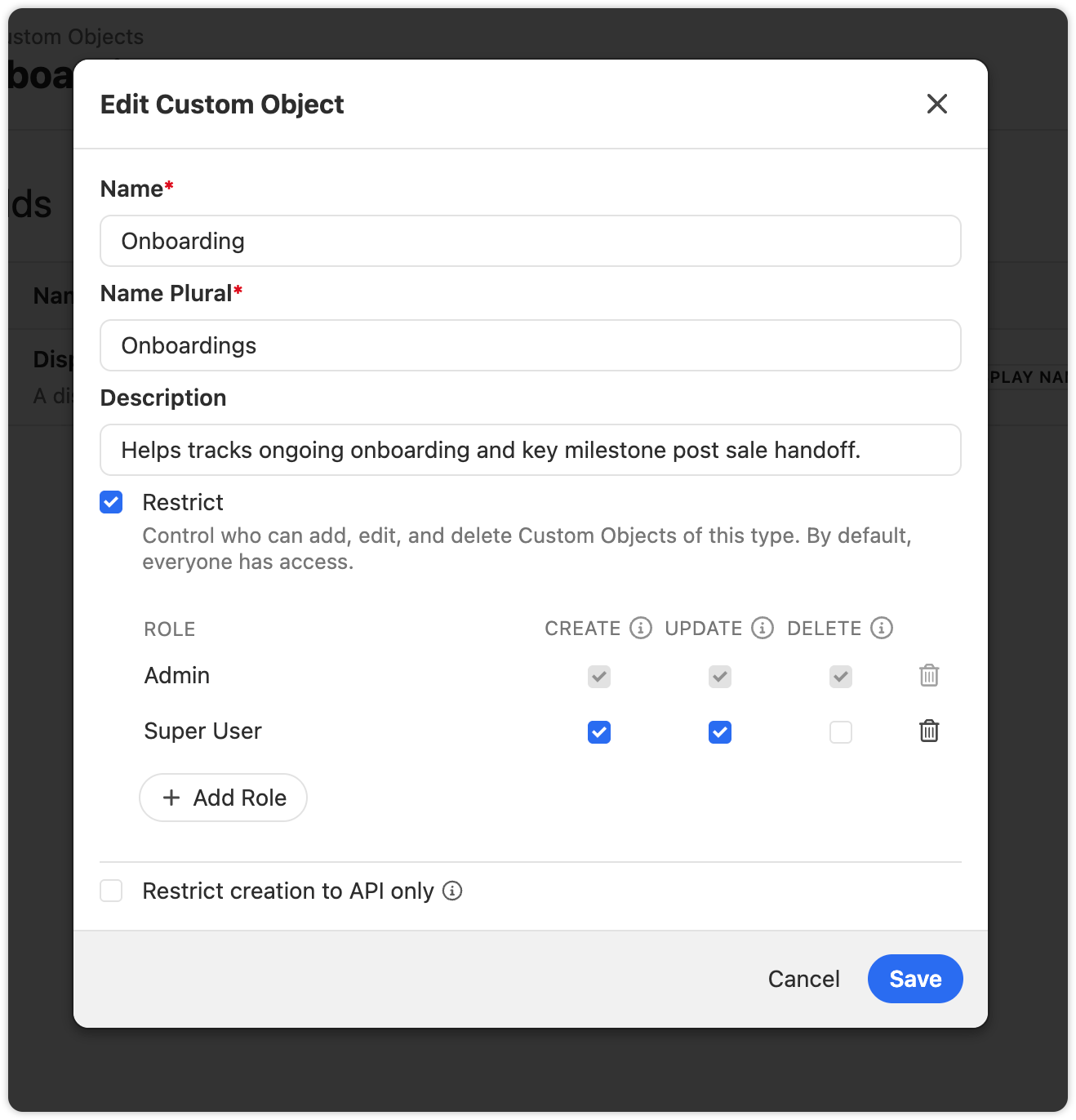 Add, Edit, and Delete are now distinct permissions you can assign per role for both Custom Objects and Custom Activities. Existing restrictions carry over, so users keep their current access; you can add finer granularity as needed.