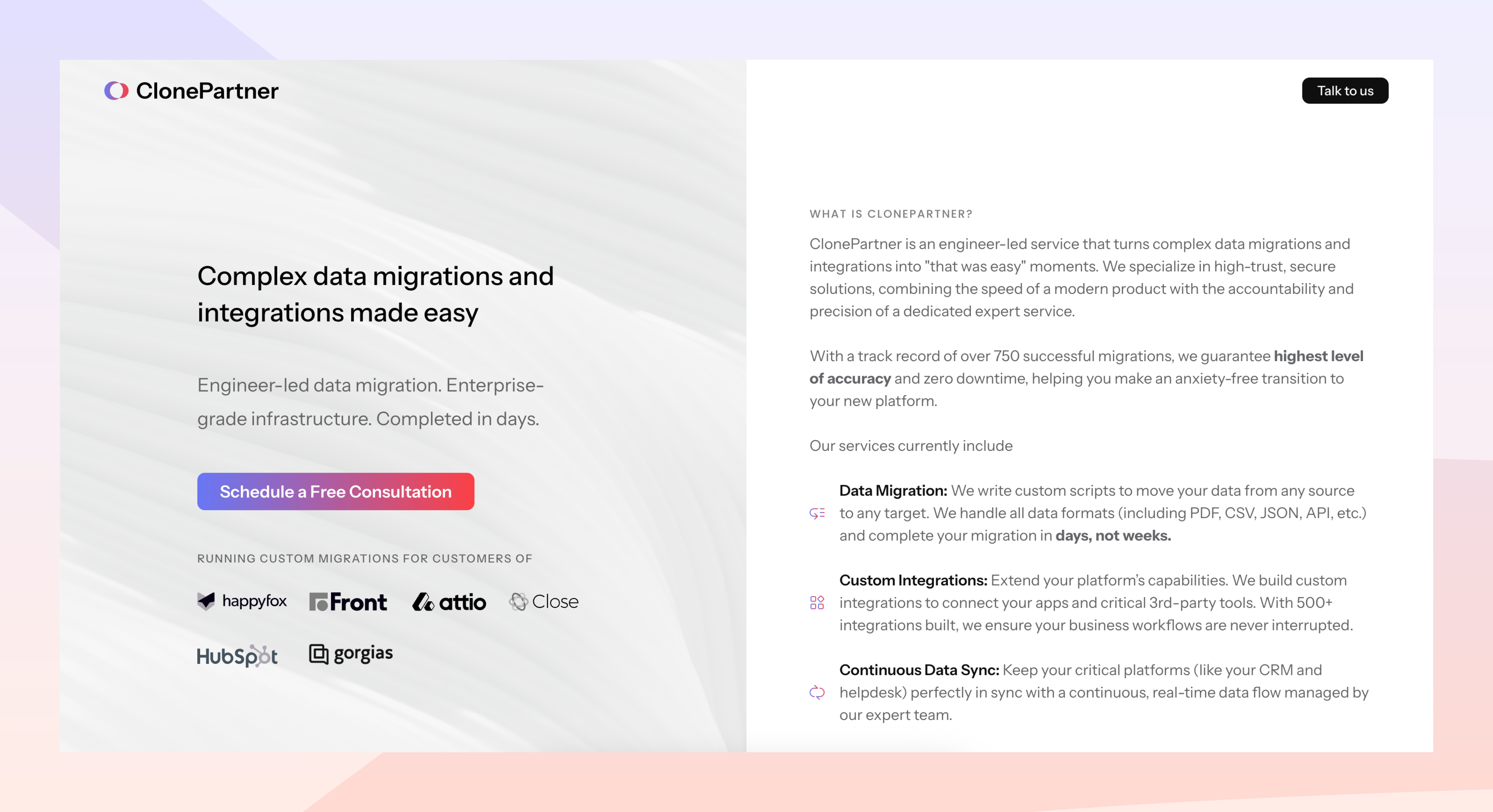 ClonePartner helps businesses move to Close with confidence. Our migration process is built by engineers who understand data deeply and value precision and speed. Every migration is handled end-to-end to preserve your sales history, activities, and relationships exactly as they were.