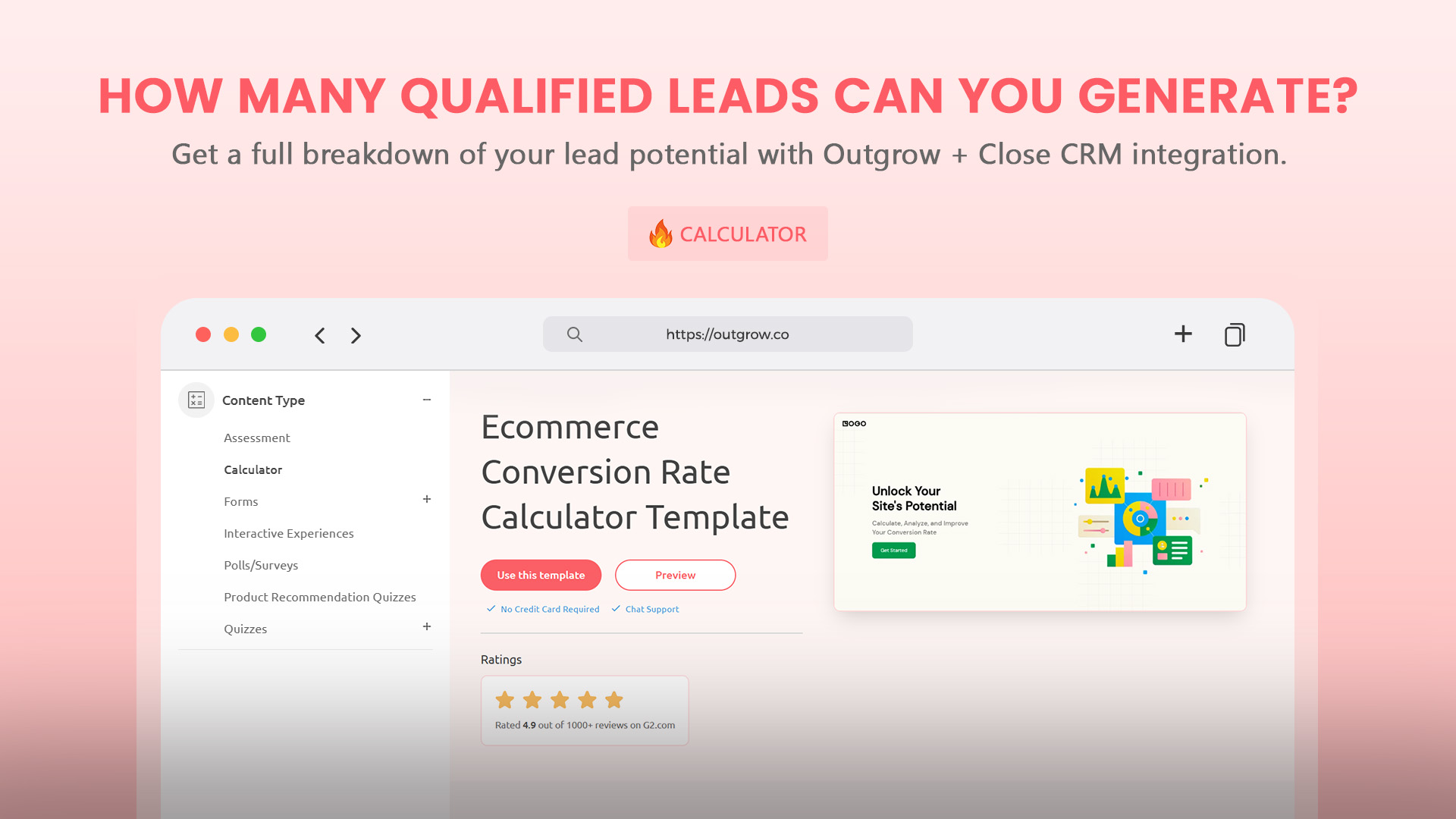 Easily make and integrate interactive content like quizzes and calculators with your CRM using the native Outgrow + Close integration. Automatically create and update your Close Contacts when a prospect completes a quiz, calculator, or assessment, capturing enriched lead data like scores, answers, and segments directly inside Close. Increase the number of qualified leads for your team by embedding Outgrow content on your website or sharing it via link. Outgrow also allows you to automate lead routing based on quiz outcomes, set up score-based segmentation, trigger Close sequences on completion, and more.