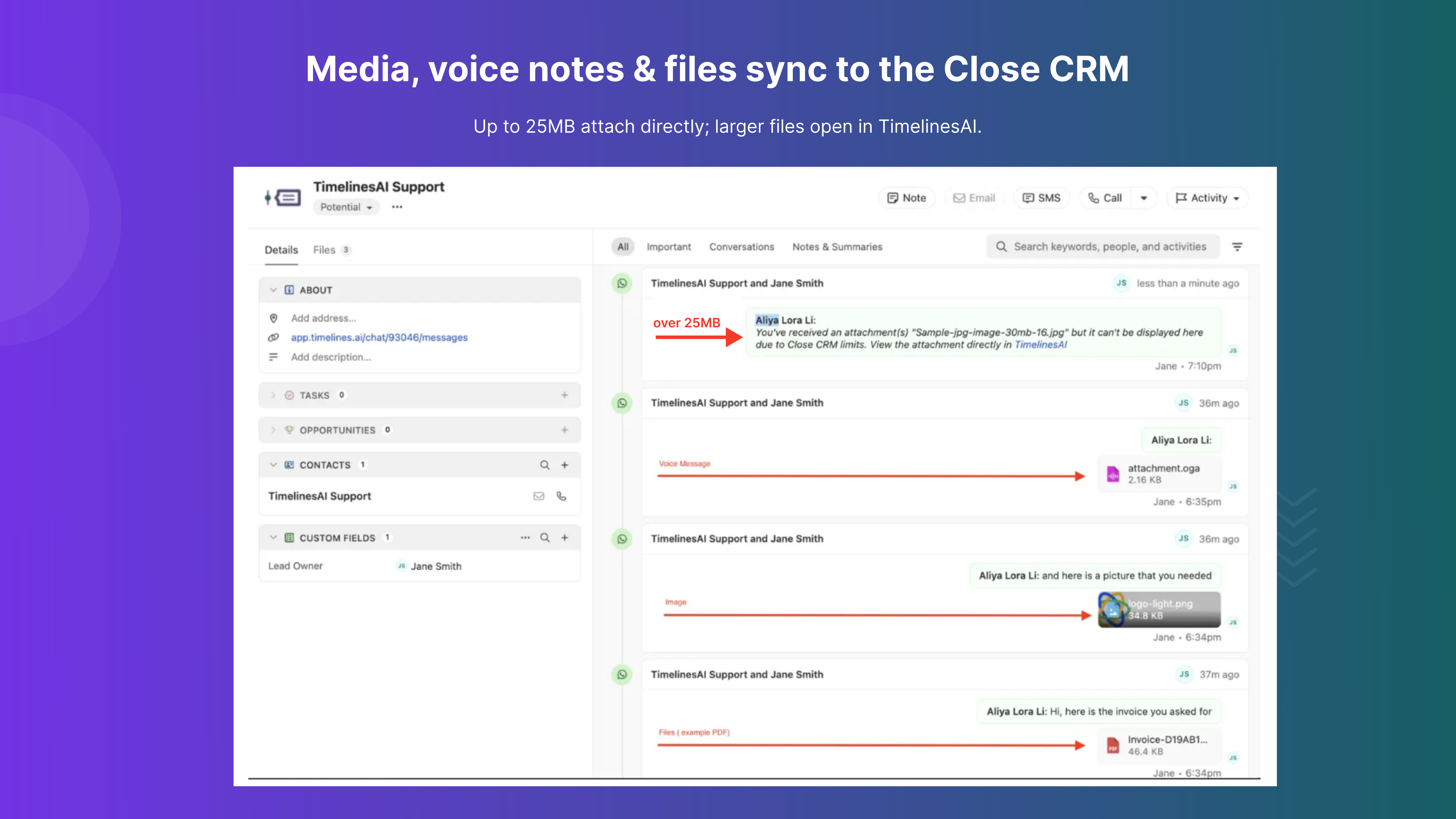 When customers send photos of products they need, documents for review, or voice messages with requirements, everything syncs to Close CRM automatically. PDFs, images, and files up to 25MB attach directly to the conversation record. Even location pins from WhatsApp appear as clickable maps in Close, perfect for service businesses or delivery coordination.