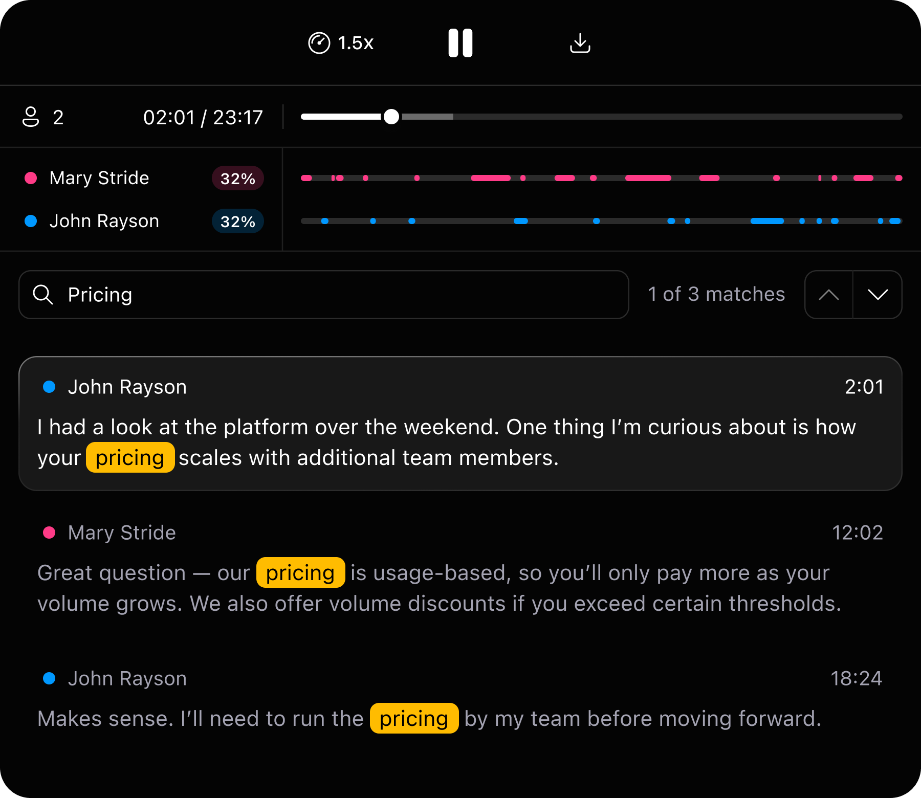 Replay call recordings so you coach with facts, not memory. Use the transcript to jump straight to the moments that need feedback—with full context.